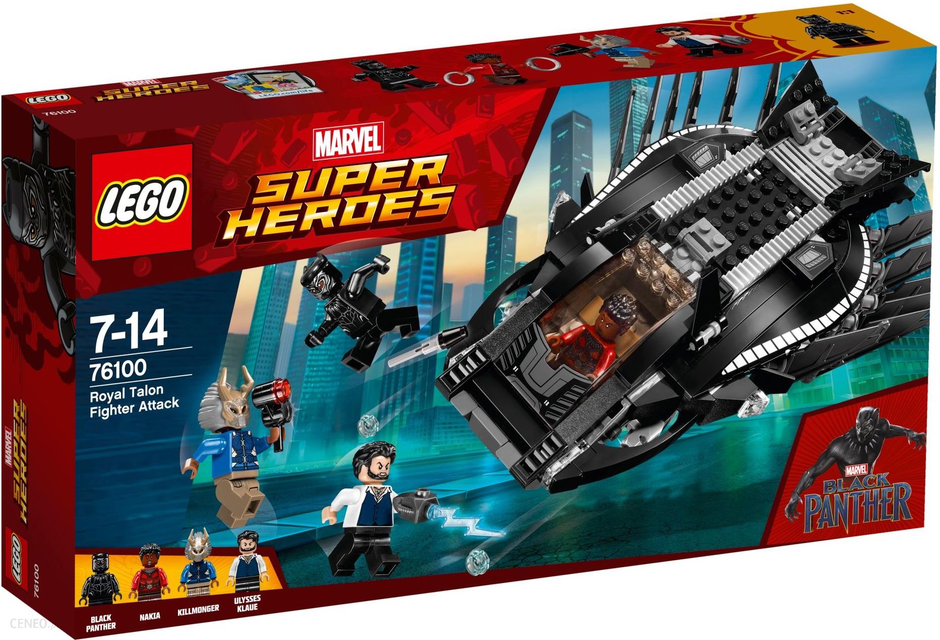 Sięgnij po odlotowy zestaw Royal Talon Fighter Attack z serii LEGO® Marvel Super Heroes i pomóż Czarnej Panterze oraz Nakii wygrać ostateczną potyczkę z superzłoczyńcą Killmongerem oraz Ulyssesem Klaue.